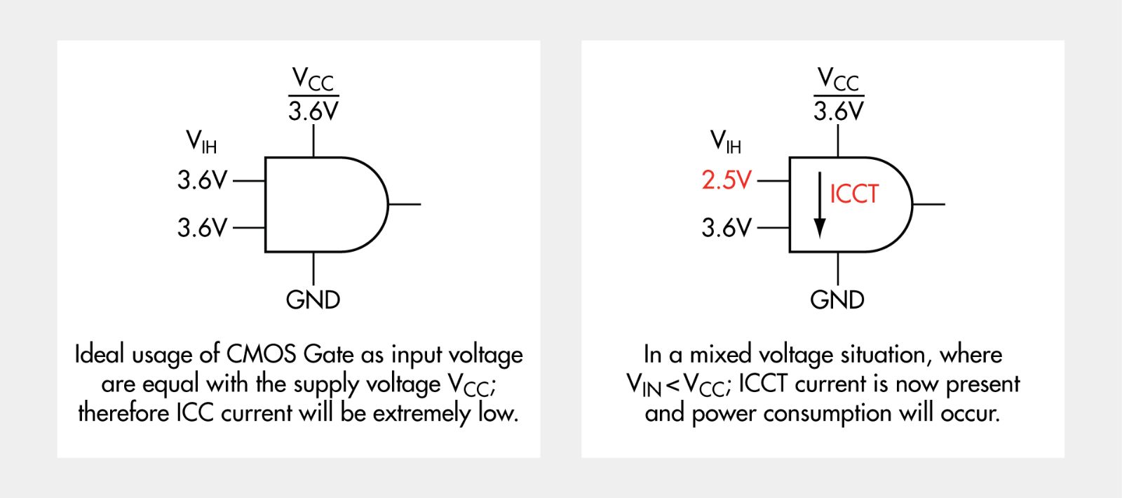 *在混合电压情况下,若Vin < VCC,ICCT电流出现,功耗也随之产生。