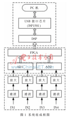 如图1所示,系统由信号调理电路模块、A/D采集模块、USB数据传输模块三个部分组成。