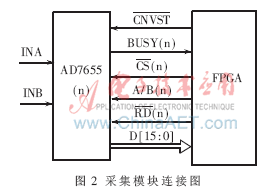 A/D采集模块由1片FPGA和2片A/D组成,完成4路信号的模/数转换。模数转换器选择的是AD7655芯片。AD7655是一款高速、低功耗4通道16位模数转换器,采用5 V单电源供电,模拟输入信号范围为0 V~5 V;高输入阻抗,可对4路模拟输入同时高速采样并进行数字化转换,采样速率最高可达1 MS/s,支持并行或串行接口。由于本采集系统要求对各路信号的相位严格一致,而AD7655只能同时对4个通道中的2路信号同时进行采样,因此,1片A/D仅连接了2路模拟信号。另外,为了保证所有通道信号的相位一致性,2片A/D需要使用同一个转换信号来控制转换的进行,故在电路连接时,把每个A/D芯片的转换信号(CNVST)管脚连接在一起,然后连接到FPGA上的转换信号输出管脚上,由FPGA输出的转换信号驱动。FPGA与A/D之间的数据读取采用总线的方式,将每一片A/D的读控制信号都独立连接到FPGA上,由FPGA控制各路采样数据的读取。采集电路连接如图2所示。