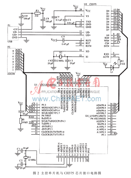 基于USB主机模式下文件级子程序库编程的需要,主控单片机采用宏晶科技有限公司的STC12C5A60S2。该单片机工作频率可达35 MHz,具有1280 B片内RAM数据存储器与60 KB片内Flash程序存储器,8通道10 bit高速ADC,2个全双工异步串行口[4],完全满足数据采集与CH375主/从双模式的控制要求。