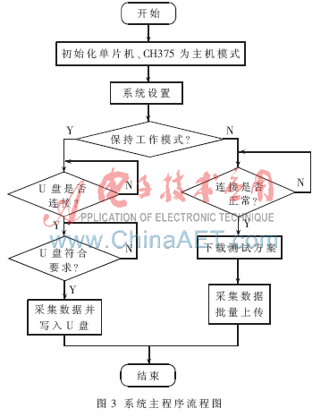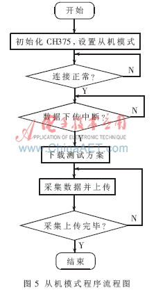 此模式下,单片机通过CH375与PC机进行通讯,完成采集方案下载与数据上传,程序流程图如图5所示。