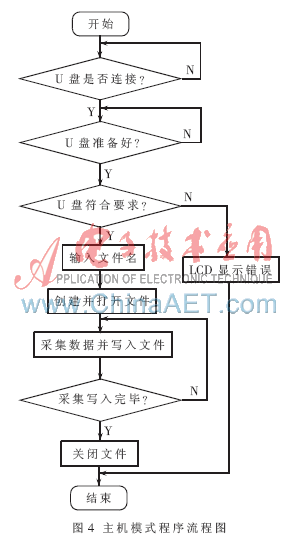 系统工作模式由主控单片机外接键盘动态切换。开机后默认工作于主机模式,等待USB存储设备连接。单片机检测存储设备连接并判断符合要求后,系统可正常测试采集数据,并转存于外接存储设备,供后期导入PC机分析处理。测试条件允许时,也可将系统设置为与PC机直接相连的从机模式。这时,数据采集过程完全由上位机控制,可实现较为复杂的性能参数与故障分析测试,提高工作效率。