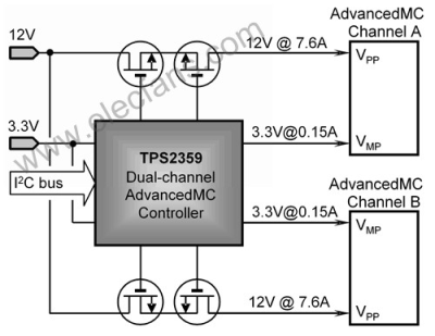 高级电信计算架构 (ATCA) 标准提供了一种设计电信设备的模块化方法。该行业标准的采用不但加速了产品设计而且还简化了现场升级。 在 ATCA 构架中,每一个 Carrier Blade 设备都要包括多达 8 个 AMC 模块,而这些模块均需要热插拔保护。载波板为每个 AMC 模块提供了两个主要电源:一个 3.3V 管理电源以及一个 12V 有效负载电源。为了帮助设计人员满足这些要求,我们设计了一款全功能双插槽 AdvancedMC™ 控制器 TPS2359,以提供支持两个 AMC 模块所必须的所有保护和监控电路。该控制器全面集成了管理电源浪涌控制、过电流保护以及 FET ORing 功能。添加两个外部电源晶体管可为每一个有效负载电源通道提供所有这些相同的功能。图 1 显示了双通道 AMC 应用的简化结构图,两个通道均由同一个电源供电。也可使用独立的电源为这两个通道供电。