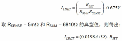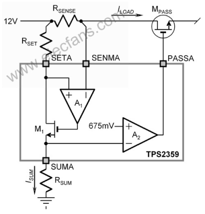 图 2 有效负载电源电流限制电路示意图电流限制电路包括两个放大器:A1 和 A2。放大器 A1 使得外部电阻器 RSET 两端的电压与外部电阻器 RSENSE 两端的电压相等。流经 RSET 的电流同时也会流经外部电阻器 RSUM,从而就在 SUMA 引脚上生成了一个如下式所示的电压: