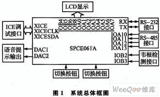 在射频读写器中,需要分析与处理的常见信号包括RS-232信号、RS-485及韦根信号。对这些信号的处理可以采用凌阳SPCE061A单片机。凌阳SPCE061A单片机具有51单片机的常用功能,片内资源高度集成,如ADC、DAC、RAM、FLASH、定时器、锁相环、低电压检测及复位、看门狗、ICE接口等等;另外,SPCE061A内嵌32K字闪存,其u’nSP指令系统还提供具有较高处理速度的16位×16位乘法运算指令和内积运算指令,能方便、快捷地处理各种复杂的数字信号。因此,本系统采用SPCE061A作为核心控制电路来进行外围电路开发,系统的总体框图如图1所示。