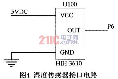由于HIH-3610湿度传感器为线性输出,因此它与MSP430F149的接口电路非常简单。如图4所示。