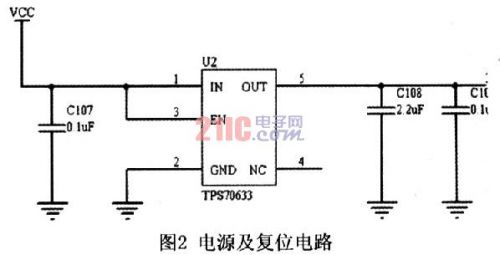 整个系统采用3.3V供电,考虑到硬件系统要求电源具有稳压功能和纹波小等特点,另外也考虑到硬件的低功耗等特点,因此系统硬件的电源部分采用TI公司的TPS76033芯片实现,该芯片能很好地满足本硬件系统的要求。