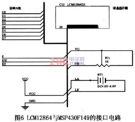 同时,与单片机等微控制器的接口界面灵活(三种模式:并行8位/4位,串行3线/2线)。本系统由于MSP430F149的端口丰富,所以采用并行8位模式。