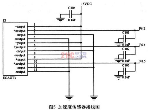 该加速度传感器采用电桥式测量,传感器共有12根接线,每轴有电源线和地线,及输出线两根,三轴可以独立供电。如图5所示。