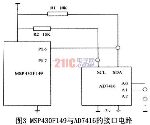 AD7416是美国模拟器件公司(ADI)推出的单片低功耗数字温度传感器,其内部包含带隙温度传感器和10位A/D变换器,可将感应温度以0.25℃的分辨率转换为数字信号。单片机通过ⅡC接口可对内部寄存器进行读写操作,并允许8片AD7416挂在同一串行总线上。该温度传感器可广泛应用于环境温度检测、工业过程控制、家用电器、电池充电、计算机系统等。其功耗极低,在应用于暖气管道温度测量时,采用特定的电源管理模式,以20s采样周期工作,平均功耗仅66(nW),很适合与TI公司MSP430超低功耗单片机构成电池供电的热能计算表,使随机电池工作时间长达5年以上。利用P1.6接10kΩ上拉电阻分别模拟I2C的SCL、SDA,硬件连接图如图3所示。