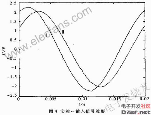 利用信号发生器产生正弦信号,叠加2.5V的直流偏移后输入到两个A/D同步采集通道(通道0和通道8),进行测量实验。信号I视为电压无功控 制器待测量的电压信号;信号II视为电流信号。实验一的输入信号波形见图4,频率为50.63Hz,电压U(信号I)领先电流I(信号II)27.6度, 实验结果见表1;实验二输入信号波形见图5,频率为49.69Hz,电压U(信号I)落后电流I(信号II)44.5度实验,结果见表2。