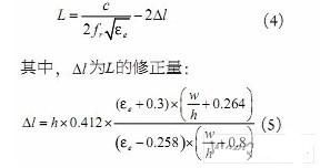其中,h、w分别是天线的高度和宽度。但在实际设计时应考虑边缘场的影响,要对L值进行修正,因此L由公式(4)决定: