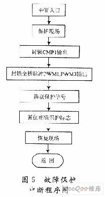 为了保证超声电源正常工作,除设计各种故障的硬件保护电路,同时采用软件保护。保护由硬件、软件共同实现,保证系统可靠运行。软件保护是通过对检测出的信号进行滤波采样后与DSP中断级别最高的XINT2相连接,当故障发生时,进入软件中断程序,封锁所有PWM脉冲输出,实现保护效果。中断保护程序流程如图6所示。