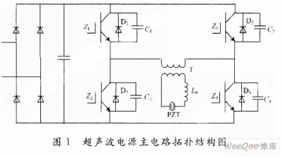 超声电源的主电路采用全桥逆变拓扑结构,如图1所示。其中:Z1~Z4为功率主开关管;D1~D4为Z1~Z4内部反并联寄生二极管;C1~C4为外接并联电容或者功率管的寄生电容;T为高频脉冲变压器;L0为串联调谐匹配电感;PZT为超声换能器。