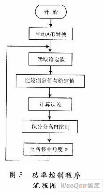 在此采用TMS320LF2407A来实现PS-PWM算法,利用其EV产生PWM控制信号。功率控制程序的作用是通过将从负载处检测到的电流值与功率设定量相比较,其差值通过数字PI控制算法进行处理,进而得到所需要调整的移相角度θ值,结果返回主程序影响比较单元1(CMPRl)的设定值。PS-PWM功率控制算法如图5所示。
