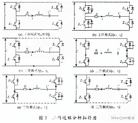 (1)工作模式1[t0时刻](见图3(a)):在t0时刻,Z1和Z4同时导通,电流i的流向:Z1→R→L→C→Z4。