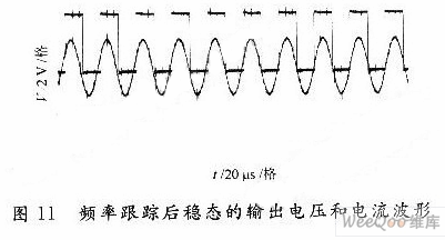 选取的超声换能器型号是DH-6160F-15S-3,其谐振频率为25 kHz,谐振阻抗为15Ω,静态电容为27000 pF,通过计算,其匹配电感为O.75 mH。图7、图8分别给出移相角分别为φ=0°,φ=45°时的输出电压u和输出电流i仿真波形。由仿真波形比较分析,当移相角φ逐渐增大,其输出电压脉宽逐渐减小,电流幅度逐渐减小,可见调节φ的大小即可以实现输出功率的调节。另外,功率管工作在ZVS软开关状态,降低了开关损耗和电压电流应力,逆变器始终工作在负载谐振状态,负载侧的功率因数高,控制简单,提高电源的可靠性。根据前面的设计,对3 kw/30 kHz的超声波发生器进行实验,下面给出逆变桥的驱动波形,PS-PWM控制输出波形,频率跟踪实验波形。图9为θ=60°时Z1和Z4的驱动波形,图10为θ=60°时输出电压和电流波形;图11为频率跟踪后稳态的输出电压和电流波形。