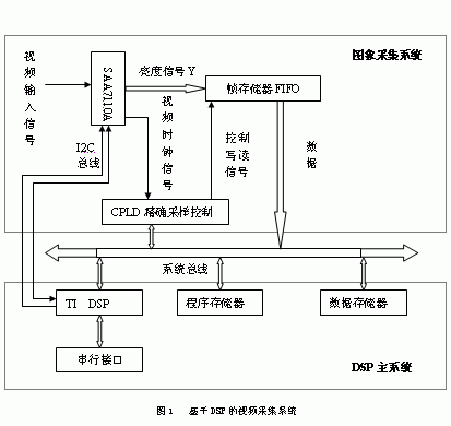 一般的视频信号采集系统一般由视频信号经箝位放大、同步信号分离、亮度/色度信号分离和A/D变换等部分组成,采样数据按照一定的时序和总线要求,输出到数据总线上,从而完成视频信号的解码,图中的存储器作为帧采样缓冲存储器,可以适应不同总线、输出格式和时序要求的总线接口。
