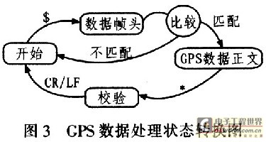 GPS与ARM之间用RS232串口方式进行通信,串口对象负责接收数据,并把接收到的数据放置到串口缓冲区。GPS对象按照协议结构负责处理串口对象接收到的数据。图3为GPS数据处理之间的状态转换示意图。GPS数据处理状态共包括4个状态:开始状态、数据帧头状态、GPS数据正文状态和校验状态。