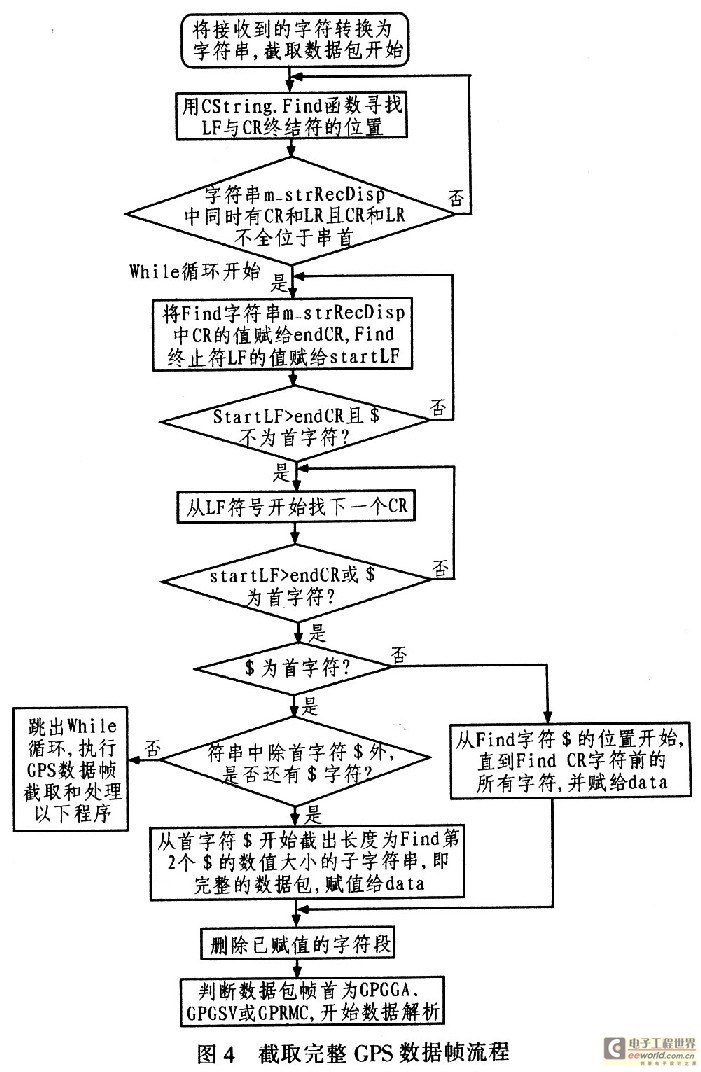 了解了GPS数据处理的四个状态之间的相互转换,下面论述一个完整的GPS数据帧的提取和处理,它是获取车辆GPS定位数据的关键。一个完整的GPS数据帧的提取流程如图4所示。