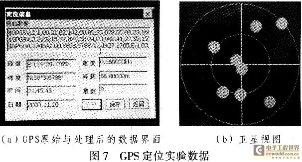 设置好串口参数后,打开串口COMl,既可获取实验数据。图7为在某型军车上一次实测的数据。实测数据界面拍摄的时间为2009年11月10日晚上9点45分,地点为某训练场。数据在静止的状态下测得。该定位显示的数据包括“原始数据”和解析后“经纬度、时间、海拔”等信息。通过分析图7(a)界面的数据发现,$GPGSV语句有两条,而在“星数”对应的Edit框中显示的定位所用卫星数为8,由于每一条GPGSV最多能显示4颗卫星的信息,故$GPGSV语句为两条。这说明星数与$GPGSV语句数是吻合的。而获取有效的GPS定位信息,至少需要4颗定位卫星。这也说明此次数据是有效的定位数据。