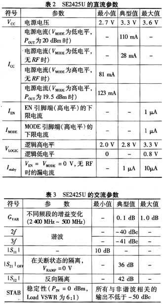 在VEN=VCC0=VCC1=VCC2=VCC3=3.3 V,VMODE为低电平,PEN=-6dBm,TC=25℃,f为2.45GHz条件下,SE2425U的交流特性如表3所列。