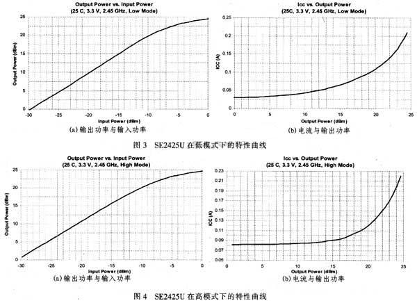 在VEN=VCC0=VCC1=VCC2=VCC3=3.3 V,VMODE为高电平,TC=25℃,f=2.45GHz的检测条件下,SE2425U在高模式下的特性曲线如图4所示。