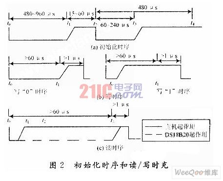 初始化时序、读/写时序分别如图2(a)、图2(b)、图2(c)昕示。