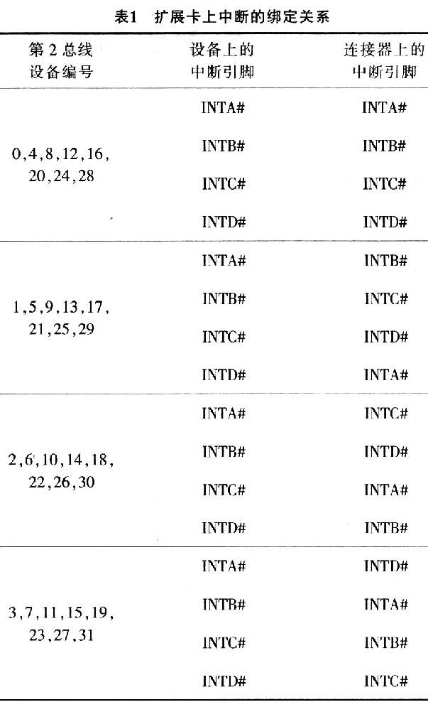 PCI2050B支持9个从设备,在初始化配置空间读写时,PCI2050B作为上一级PCI总线的操作对象,提供了IDSEL引脚进行器件选择,该引脚可以连接到高24位PCI总线中的任意一根。同时,为了减少地址线的容性负载,需要在该信号连线上串接一只1 kΩ的电阻。本模块仅扩展一级总线,PCI2050B主侧的IDSEL引脚直接连接到CPCI插座J1的IDSEL。对于二级总线侧的PCI器件(本模块为INTEL82551),其IDSEL引脚经过1 kΩ的电阻连接到PCI2050B的S_AD31S_ADl6引脚的任意一根。来自从侧上的设备的INT线不通过桥。如果桥位于一个插入卡上,从侧设备的中断线直接接到连接器的中断引脚(INTA#~INTD#)。本模块中,PCI2050B是一个桥设备,INTEL82551的中断引脚直接连接到J1的中断引脚。所有从设备的中断线的连接与设备编号(即IDSEL线的连接)有绑定关系,对应关系如表1所示。4片INTEL8255l的IDSEL引脚分别连接到S_AD28、S-AD29、S_AD30和S_AD31,对应的设备编号为12、13、14、15,则器件的中断引脚INT#对应连接到J1的INTA#、INTB#、INTC#、INTD#。