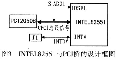 每片INTEL82551的CPCI总线信号连接到PCI2050B的从侧,应特别注意的是信号IDSEL和INT#根据表1一一对应,否则模块插到系统槽上,系统不能正确驱动模块。其中1路器件的电路连接,如图3所示。器件的IDSEL连接到S_AD31上,则器件的中断INT#连接到J1的INTD#上。