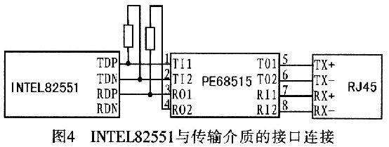 使用4片PE68515和4个RJ-45实现传输介质接口。每一路接口电路连接,如图4所示。