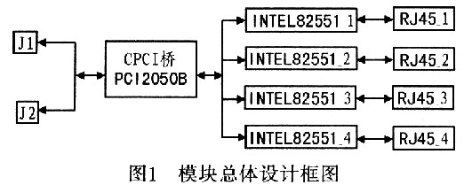 该模块采用CPCI并行总线进行设计。图1给出该模块总体设计框图,其中,通过PCI桥扩展总线分别连接4片INTEL82551,由于INTEL82551内部已集成PCI接口,PCI桥可实现与INTEL82551之间的无缝连接。J1和J2为CPCI的接口插件。