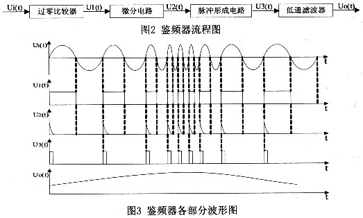 信号调理部分由脉冲计数式鉴频器完成。它由四部分组成(如图2所示),即过零比较器、微分电路、脉冲形成电路和低通滤波器,输入的调频波Ui(t)经过零比较器后变成调频方波信号U1(t),调频方波信号通过微分电路后变为微分脉冲序列U2(t),微分脉冲序列经过脉冲形成