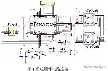 根据实验要求本系统采用8 位数模转换精度的AD5308 作为数模转换芯片,利用 C8051F005 单片机控制AD5308,通过串行通信口将各个数据分别送到相应的D/A 转换通道, 实现相位差信息转化为相应模拟电压的目的。系统主要硬件电路连接如图1 所示,单片机 C8051F005 通过SCL(时钟线),SDL(数据线),SYINC1(第一片AD5308 片选线)和SYIN2 (第二片AD5308 片选线)与两片AD5308 相连,数据线SDA 分时传送12 路数据,数据刷 新率最低为3HZ。时钟线SCL 为后者提供时钟信号,单片机通过片选SYNC1,SYNC2 选 择其中一片AD5308 工作,在本系统中,C8051F005 的P0.0 引脚与SDA 连接,P0.1 引脚 与 SCL 连接,P1.3 引脚与SYNC1 连接,P1.4 引脚与SYNC2 连接。我们选择REF195 芯片 作为参考电压源。同时为两片AD5308 提供5V 参考电压。AD5308 的LDAC 引脚接地。单 片机产生D /A 的时钟信号,并通过串行口将数据发送给AD5308,经AD5308 转换输出, 提供驱动PZT 所需的电压信号。