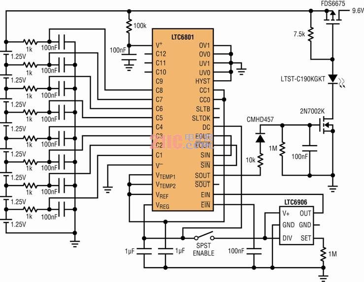 在许多应用中,LTC6801 都被用作诸如 LTC6802 等更加精细复杂的采集系统的一个备用监视器 (例如:在混合动力汽车中)。不过,它也非常适合用作面向较低成本产品 (比如:便携式工具和后备电源) 的独立型解决方案。由于 LTC6801 直接从它所监视的电池获取其工作电源,因此每个器件的可用电池电压范围因电池的化学组成而改变,旨在提供运行该器件所需的电压 —— 从大约 10V 至高达 50V 以上。该电压范围支持将 4~12 节锂离子电池或 8~12 节镍电池堆叠成组来使用。如图 1 所示,采用 LTC6801 来监视一个镍电池组 (含 8 节镍电池) 并保护其免遭过度放电式的不当使用是非常简单的。请注意,尽管只有一个欠压报警和镍电池化学组成有关,但由于存在 OV 情况,因此在充电操作期间仍将对电池组供电连续性故障进行检测。