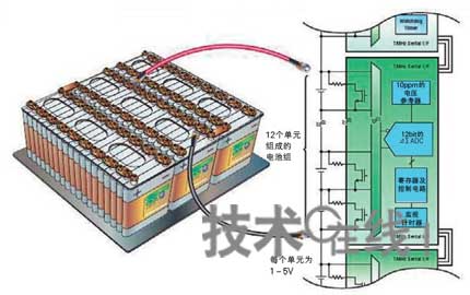 图7:监控锂离子电池的各个单元 美国凌力尔特科技的电压监控IC“LTC6802”适用于锂离子电池各个单元电压监控用途。可支持12个单元组成的电池组。该图根据该公司的资料绘制而成。 |