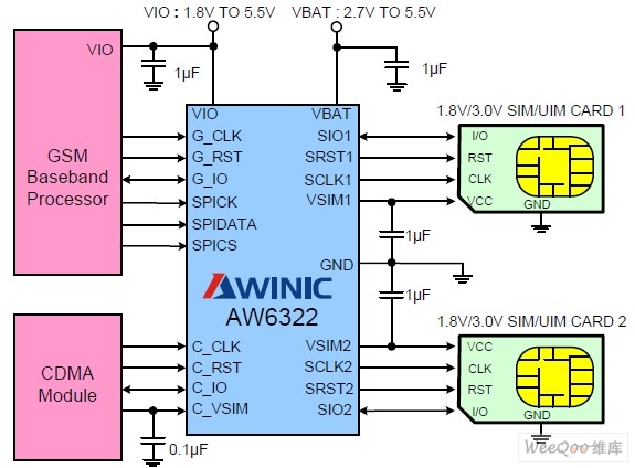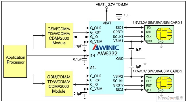 AW6332单芯片双模双待解决方案 AW6332 是一款具有通信通道选择功能的SIM 卡接口驱动芯片,能满足客户对以 CDMA 或3G 主的双模双待的需求,典型应用图4 所示。该方案可实现两个卡槽任意放置 2G 卡或3G 卡,支持2G 卡或3G 卡的所有两个不同制式的任意组合。