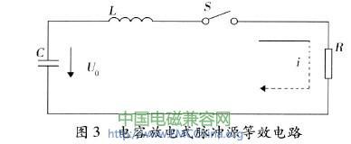 回路的等效电路如图3所示,为一个标准的RLC串联放电回路。当开关S在!=0时刻接通,电路的方程为
