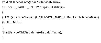 在Windows操作系统,大部分的服务器(如IIS)都是以Windows NT服务组件(service)的形式存在于系统中的,它们在系统启动后就一直运行在后台,等待事件的触发(如某个TCP端口是否有链接请求)。作为服务组件,其与一般Windows程序的不同之处是:它必然包含名为NtServiceEntry的入口函数,当Windows开始运行一个服务组件时,首先运行这个入口函数,而非通常的main函数。