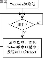 图3是子进程bridgeThread的流程。首先,使用Winsock对特定端口进行监听。然后,通过消息循环,当接收到链接请求的事件后,将串口初始化。之后,消息循环就不断响应来自Telnet和串口的写请求,将Telnet的数据发送到串口,直到收到Winsock断开链接的请求。