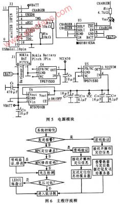 按键检测模块和电池检测模块都是以中断方式执行的。当有按键按下时,就会产生中断,通知控制器进行扫描,判断是哪个键按下,然后进行相应的处理;电池检测模块以一定时间间隔检测电池电量,如果电池电量不足则通知控制器开始计数,如果连续检测到电压过低状态超过一定次数后,则使相应的LED闪烁,提醒用户充电。