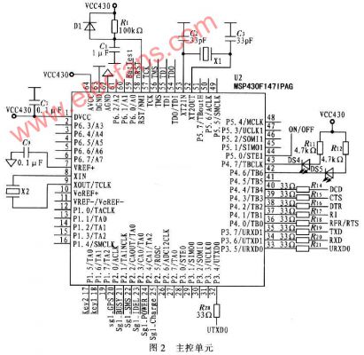 个人定位终端的硬件组成如图1所示。为了解决GPS在室内和高层建筑密集区难以定位的问题,选用AnyData公司的DTGS-800 GPSOne模块;为了缩小体积、降低功耗和成本,主控单元MCU选用超低功耗的16位单片机MSP430F147,显示器选用LED。单片机负责控制 GPSOne模块发起定位请求,接收并解析CDMA网络控制中心发送的信息,获取当前的经、纬度及其他信息,并以短信的方式送至控制中心或操作者的手机。主控单元MCU如图2所示。它包括MSP430F147,外接高速晶振和低速晶振,在不需要高速处理时,可将高速晶振关闭,只使用低速晶振,以降低功耗;MSP430F147有2个串行异步通信接口(USART),其中一个(DCD、CTS、DTR、RI、RFR/RTS、TXD、RXD引脚)接口连接DTGS-800的UAR-T1,另一个(URXD0、UTXDO)接口与PC机的串口相连,供系统调试使用。nRst、MS、TCK、TDI、TD0 引脚连接JTAG插座,用于程序下载和在线调试;keyl和key2引脚分别接"Help"和预留按键。外接的LED DS3和LED DS4分别用指示电池电量不足和DTGS-800与MSP430之间的通信;BatTest用于检测电池电量。