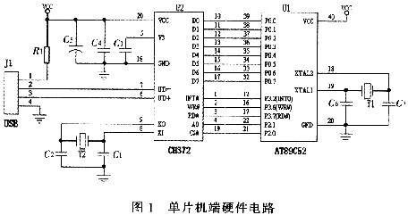 CH372芯片在本地端提供了通用的被动并行接口,包括:8位双向数据总线D7~D0、读选通输入引脚RD#、写选通输入引脚WR#、片选输入引脚CS#、中断输出引脚INT#以及地址输入引脚A0。通过被动并行接口,CH372可以很方便地连接到各种8位单片机、DSP、MCU芯片上,并且可以与多个外围器件共存。基于CH372芯片的信息和参数。这里给出了CH372芯片单片机端的USB通讯电路,如图1所示。同时,该芯片可通过普通USB传输线实现与计算机的互通,图1中J1即为USB接头。