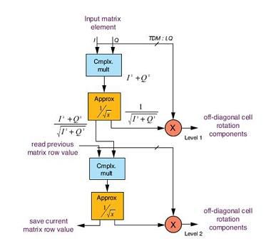 QRD 的脉动阵列结构由两种类型的处理单元构成——对角线单元或边界单元和非对角线单元或内部单元。边界单元执行矢量函数,可以生成阵列内部单元使用的旋转角度。要想得到想要的旋转角度,可以把非对角线单元中的值与对角线单元中的共轭复数相乘,然后除以复数的倒数即可。相除实际是用乘法的方式完成的,即在观察到函数接近线性的时候,乘以根据定义的间隔的多项式近似值计算出的倒数。图 3 显示了采用这种近似值在对角线脉动单元中完成这种复杂旋转的信号流程图。