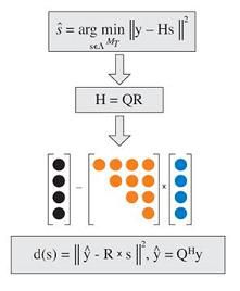 理想情况下,检测过程要求对所有可能的符号向量组合进行 ML 解决方案计算。球形检测器旨在通过使用简单的算术运算降低计算复杂性,同时还能够保持最终结果的数值完整性。我们的方法,第一步是把复杂的数值信道矩阵分解为只有实数的表达式。这个运算增加了矩阵维数,但简化了处理矩阵元的计算。降低计算复杂性的第二个方面体现在,减少检测方案分析和处理的可选符号。其中,对信道矩阵进行 QR 分解是至关重要的一步。