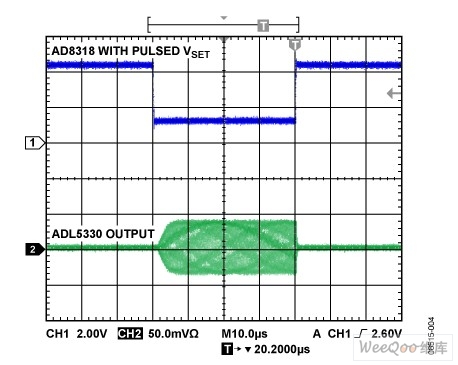 图4显示AGC RF输出对VSET脉冲的响应。当VSET降至1 V时,AGC环路以RF突发脉冲予以响应。响应时间和信号积分量由AD8318 CFLT引脚上的电容控制,这与积分放大器周围的反馈电容类似。电容增加将导致响应速度变慢。