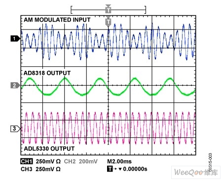 为使AGC环路保持均衡,AD8318必须跟踪ADL5330输出信号的包络,并向ADL5330的增益控制输入提供必要的电平。图3所示为图1中AGC环路的示波器屏幕截图。将采用50% AM调制的100 MHz正弦波施加于ADL5330。ADL5330的输出信号为恒定的包络正弦波,其振幅与AD8318的设定点电压1.5 V相对应。图中还显示了AD8318对不断变化的输入包络的增益控制响应。