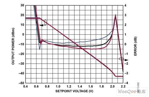 图2:ADL5330输出功率与AD8318设定点电压关系曲线,PIN = -1.5 dBm