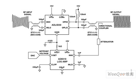 图1:ADL5330与AD8318配合在自动增益控制环路中工作