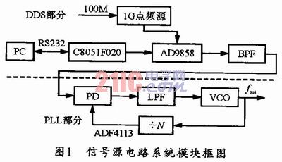 本系统的电路设计主要分为DDS模块和PLL模块两大部分,其系统框图如图l所示。